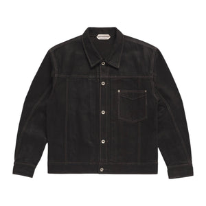 This jacket is made from vintage denim work pants. It is Overdyed black and coated with our in-house Bee-oil. It darkened the color, added weight, and gave the denim a water-resistant surface with a leathery, suede-like feeling.